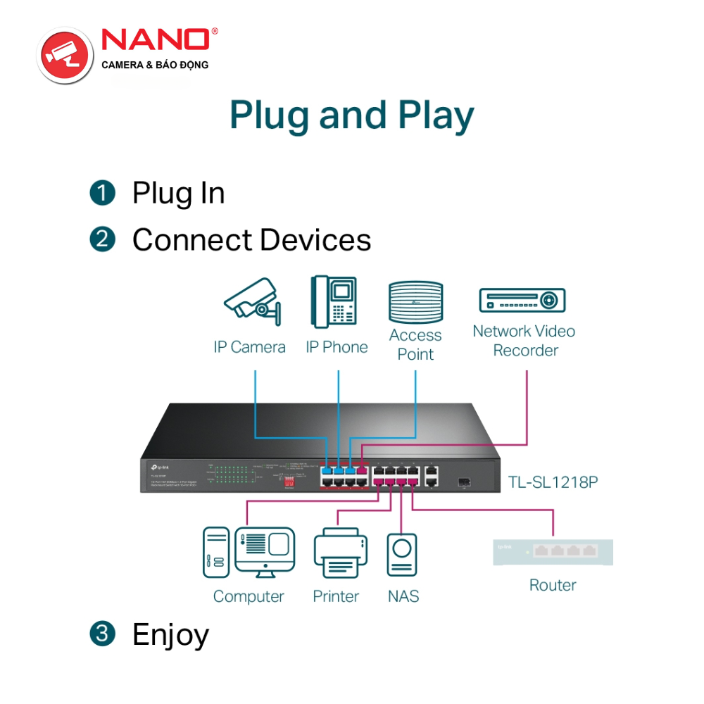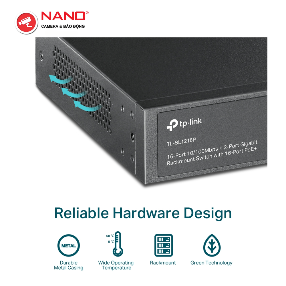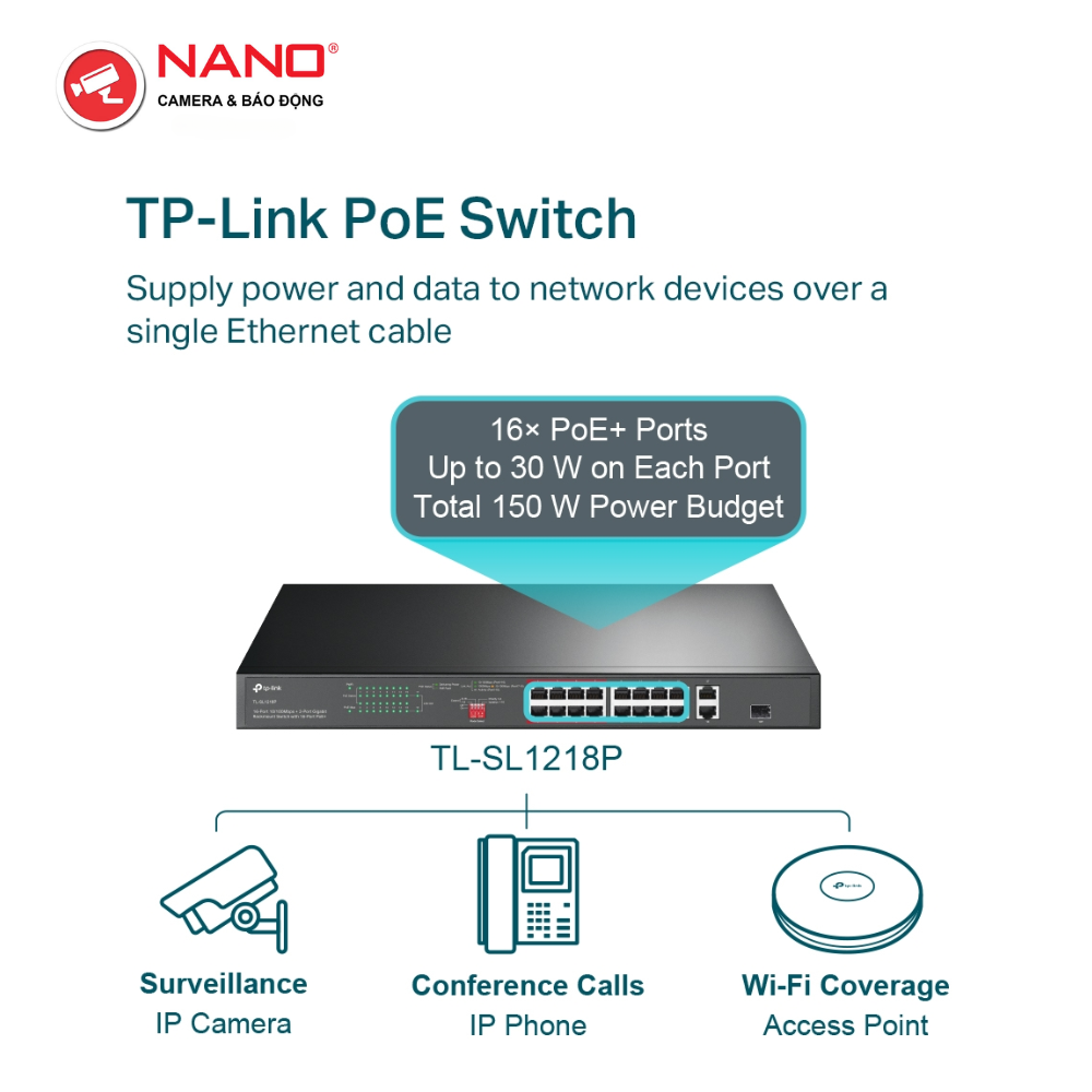 CỔNG: 16x Cổng 10/100 Mbps hỗ trợ PoE+, 2x Cổng Gigabit không hỗ trợ PoE, 1x Khe Cắm Combo Gigabit SFP