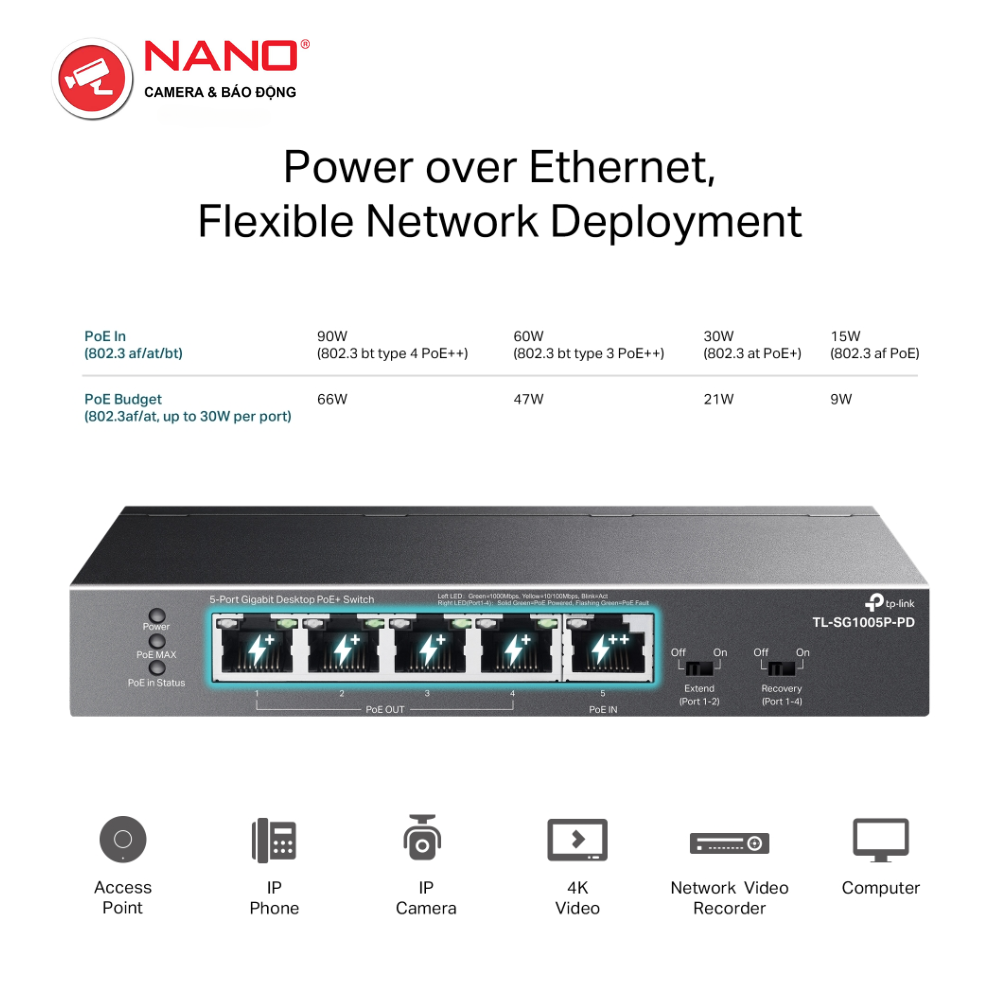 SPEC: PoE Out Ports support 802.3af/at, PoE In Port supports 802.3af/at/bt type3/bt type4. 9W/21W/47W/66W PoE Power (Powered by different PoE Standard) , Desktop Steel Case