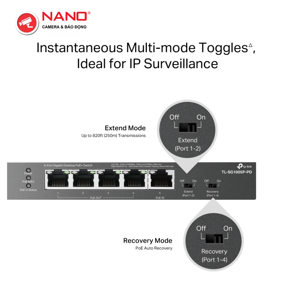 FEATURE: Extend Mode for 250m PoE Transmitting for Port1-2, PoE Auto Recovery for Port1-4, Plug and Play, Only Powered by PoE