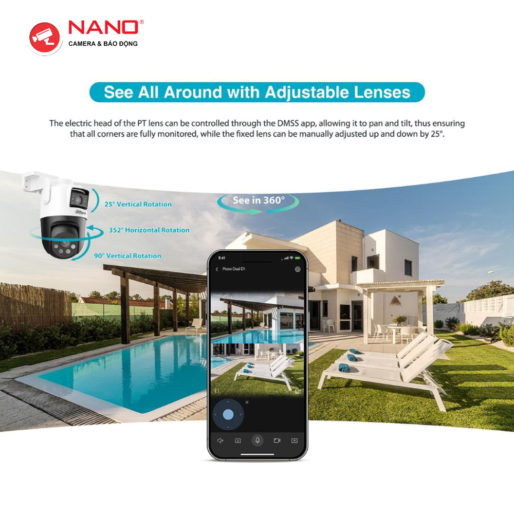 – Ống kính quay quét: 6mm (góc nhìn 49°) điều chỉnh qua app ngang 0~352°, dọc 0~90°