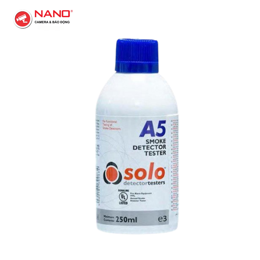 – Chai tạo khói SOLO A5 được dùng để tạo khói cho dụng cụ thử đầu báo khói Solo, chứa chất tạo khói sạch dung tích 250ml, rất nhạy chỉ cần một lượng nhỏ để kiểm tra khả năng hoạt động của một đầu báo khói thông thường, có thể sử dụng với thời gian dài, tuyệt đối an toàn và thân thiện với môi trường.