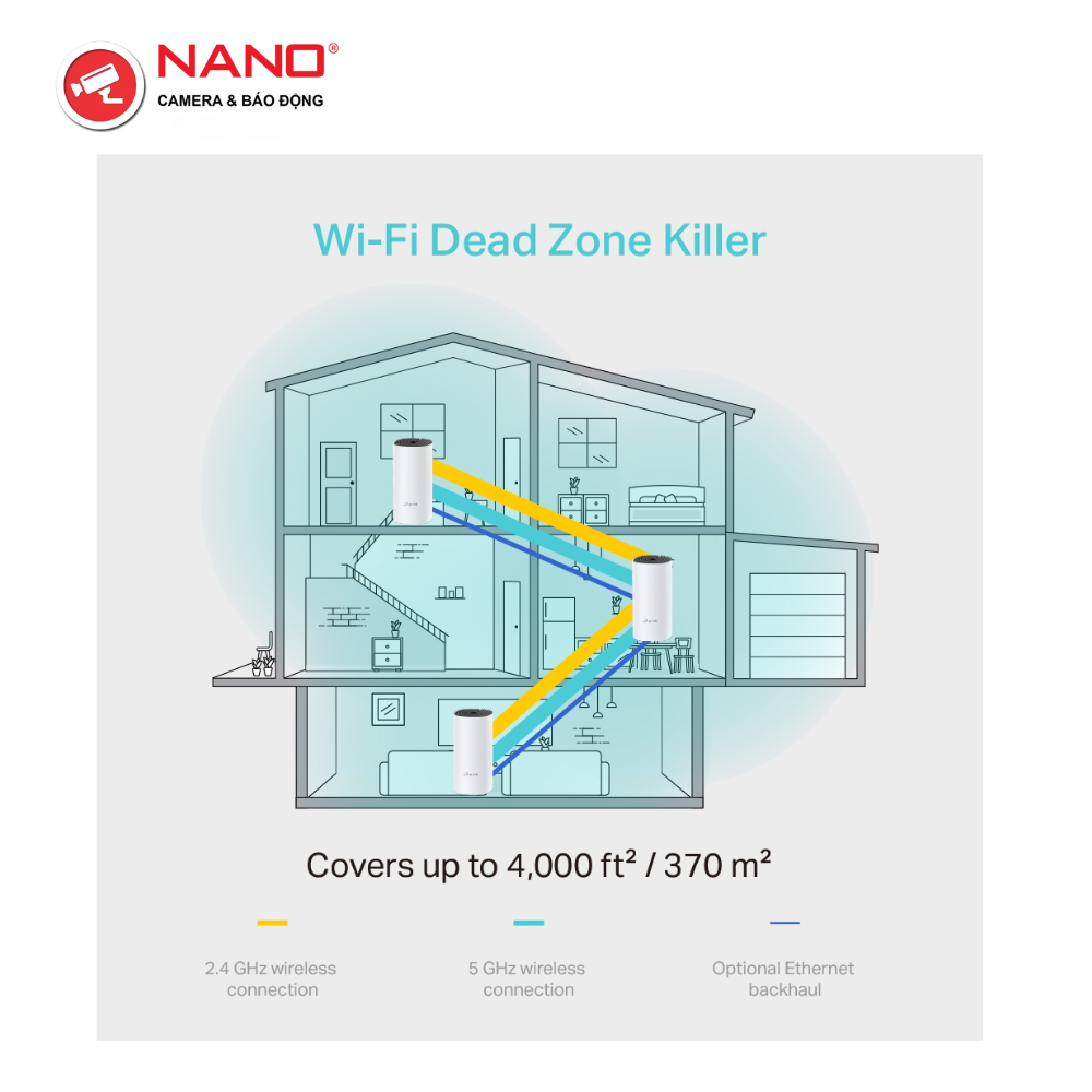 - Deco sử dụng một hệ thống các thiết bị để đạt được vùng phủ sóng Wi-Fi liền mạch cho cả căn nhà – loại bỏ các vùng Wi-Fi yếu một lần và mãi mãi!
