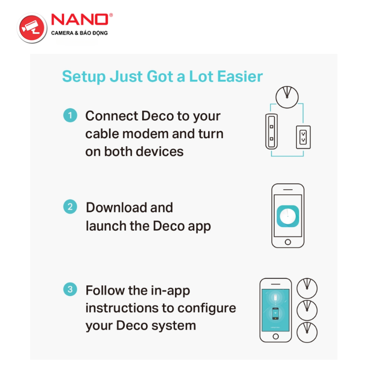 • Deco là hệ thống Wi-Fi sử dụng nhiều thiết bị liên kết để tạo nên một hệ thống Wi-Fi xuyên suốt với vùng phủ rộng lớn – giúp loại bỏ hoàn toàn các khu vực sóng Wi-Fi yếu!