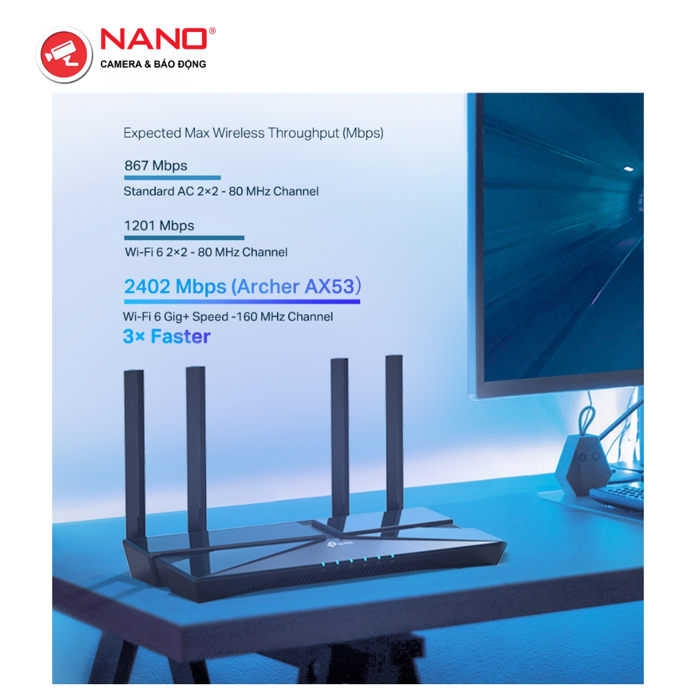 - Tốc độ Wi-Fi 6 Gigabit Thế Hệ Mới: 2402 Mbps trên băng tần 5 GHz và 574 Mbps trên băng tần 2.4 GHz đảm bảo phát trực tuyến mượt mà hơn và tải về nhanh hơn.