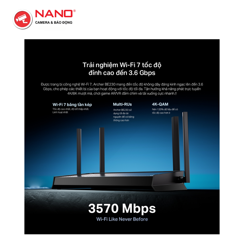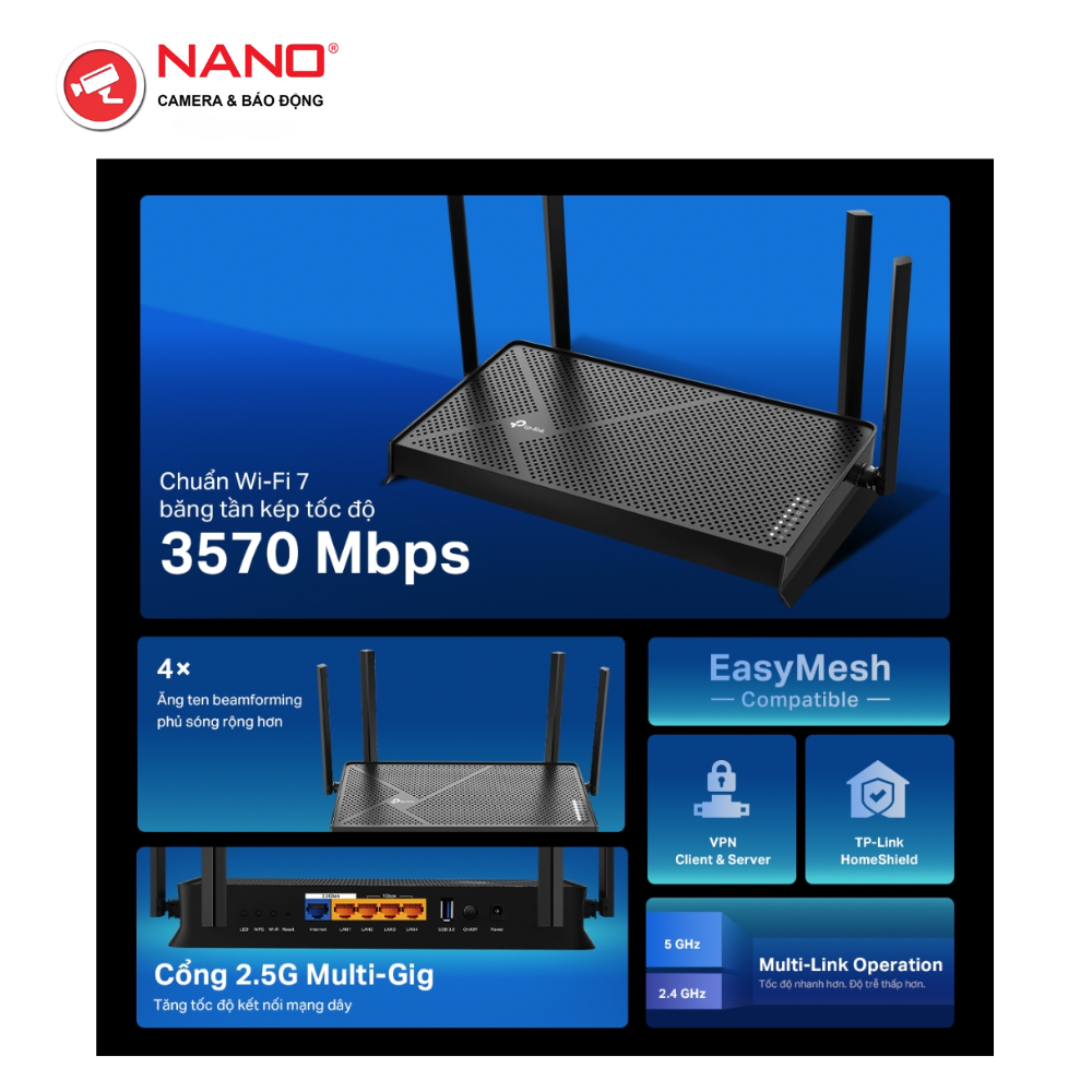 - 3.6 Gbps Wi-Fi 7 băng tần kép: Chuẩn Wi-Fi băng tần kép BE 3600 sẽ cho phép các thiết bị của bạn hoạt động với tốc độ mạng tối đa. Tận hưởng khả năng phát trực tuyến 4K/8K mượt mà, chơi game AR/VR đắm chìm và tải xuống cực nhanh.
