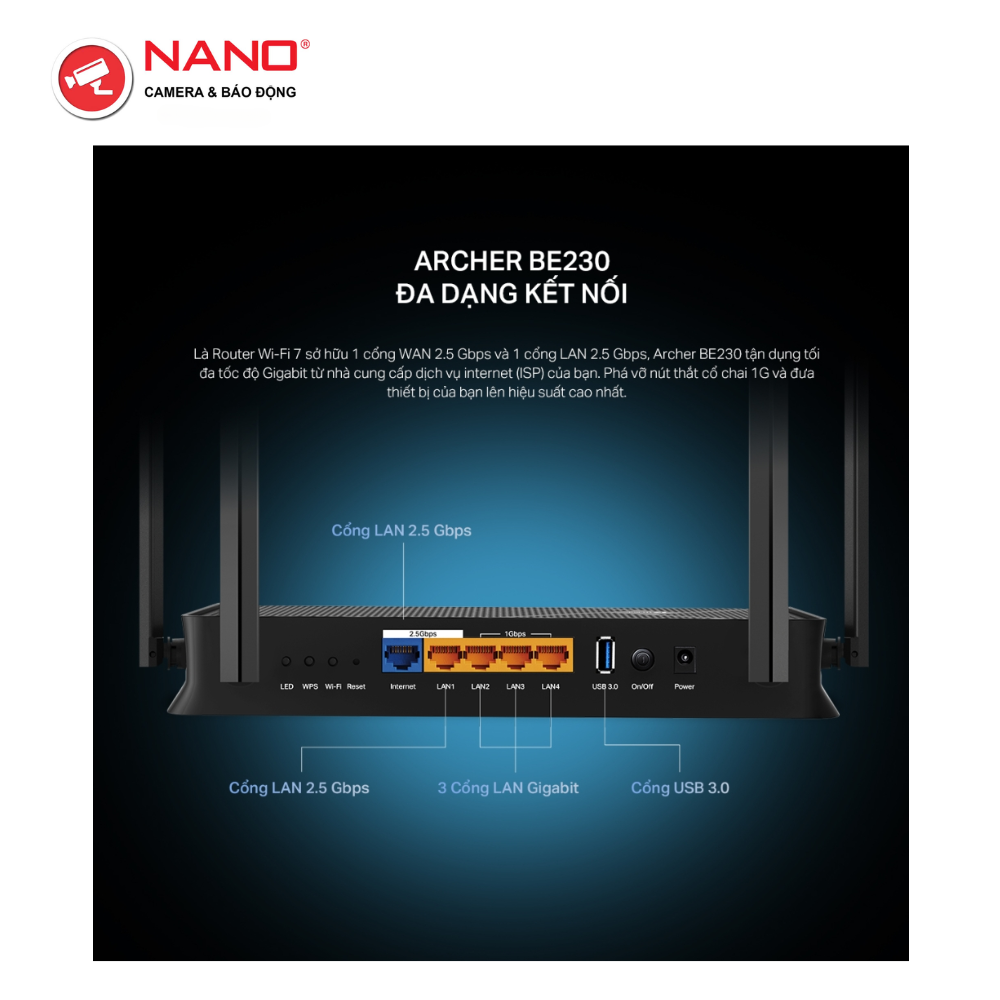 - 2 cổng 2.5G: 1 cổng WAN 2.5 Gbps, 1 cổng LAN 2.5 Gbps và 3 cổng LAN 1 Gbps cung cấp khả năng truyền dữ liệu tốc độ cao.