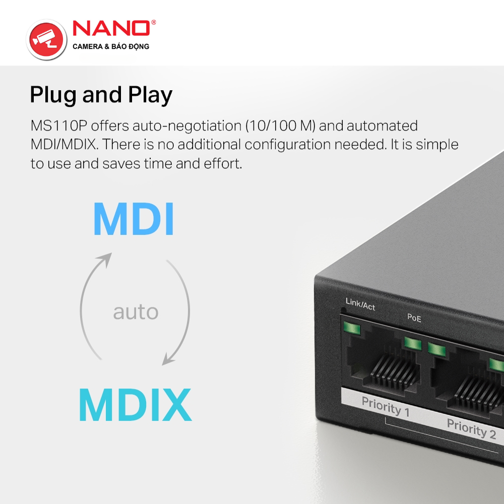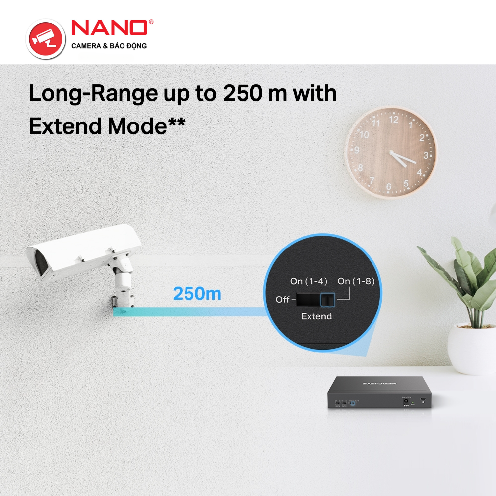 FEATURE: Extend Mode for 250m PoE Transmitting, Priority Port1-2, Isolation Mode, PoE Auto Recovery, Plug and Play