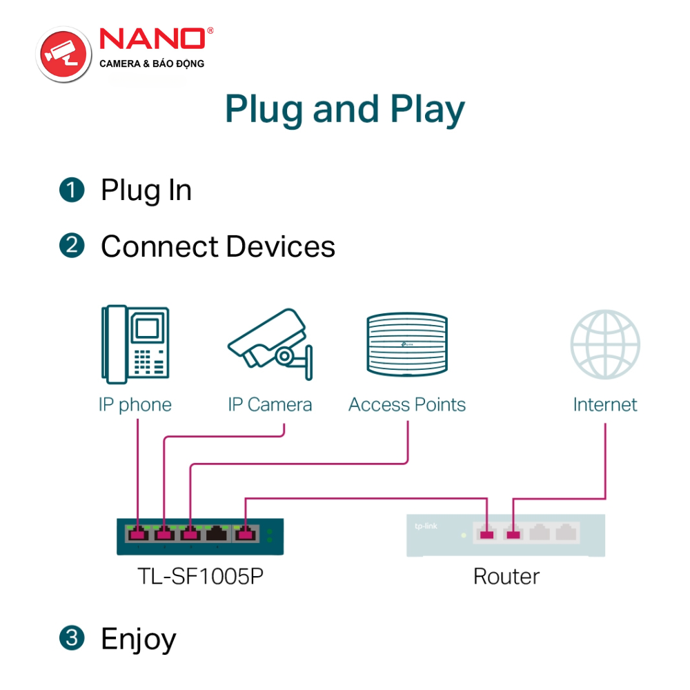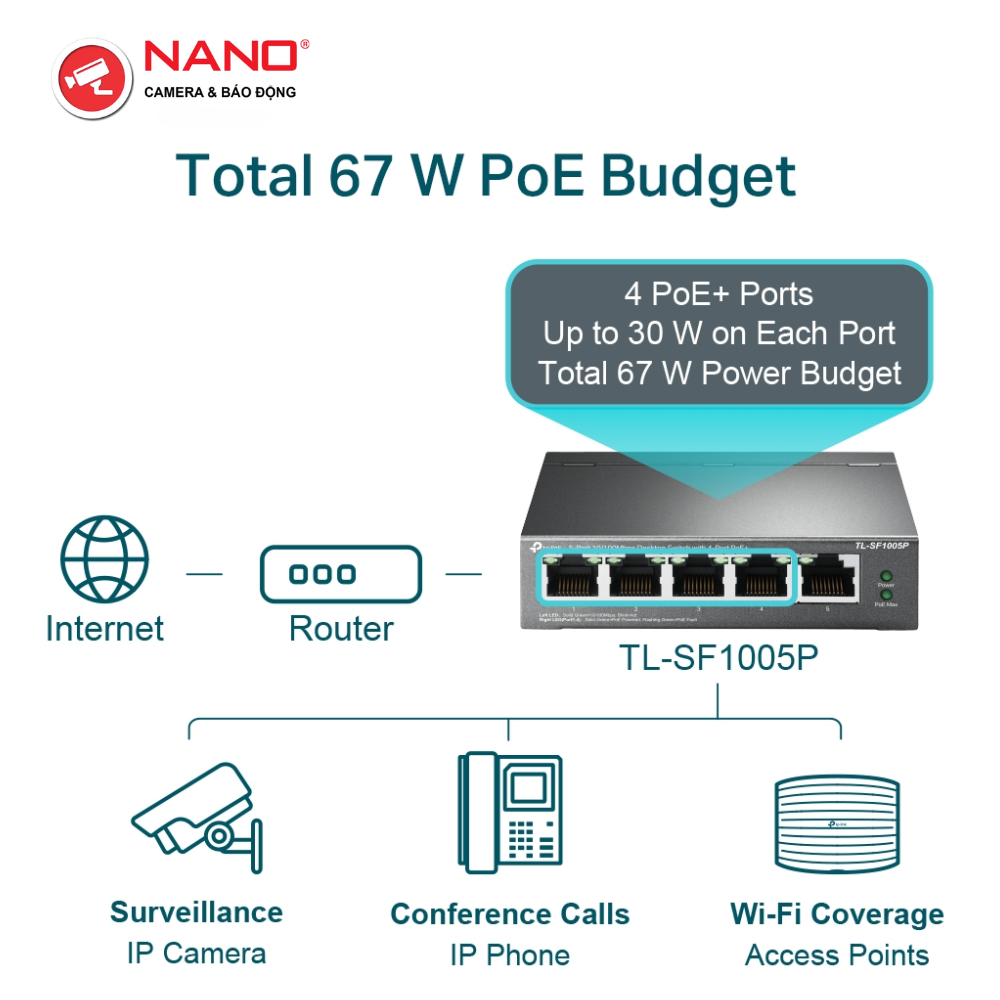 CỔNG: 4x Cổng 10/100 Mbps hỗ trợ PoE+, 1x Cổng 10/100 Mbps không hỗ trợ PoE