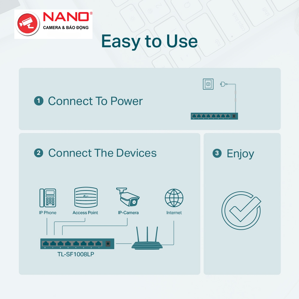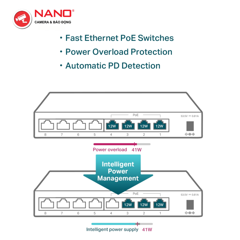 CỔNG: 4x Cổng 10/100 Mbps hỗ trợ PoE, 4x Cổng 10/100 Mbps không hỗ trợ PoE