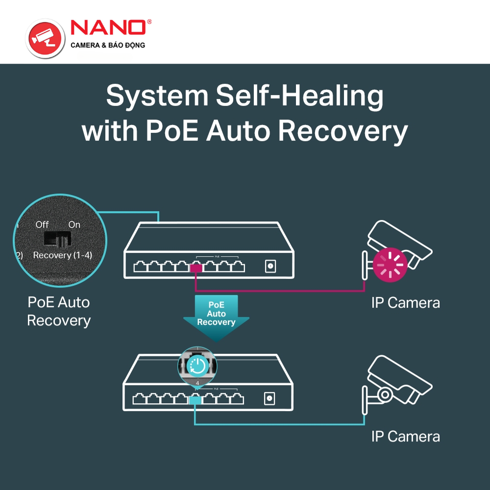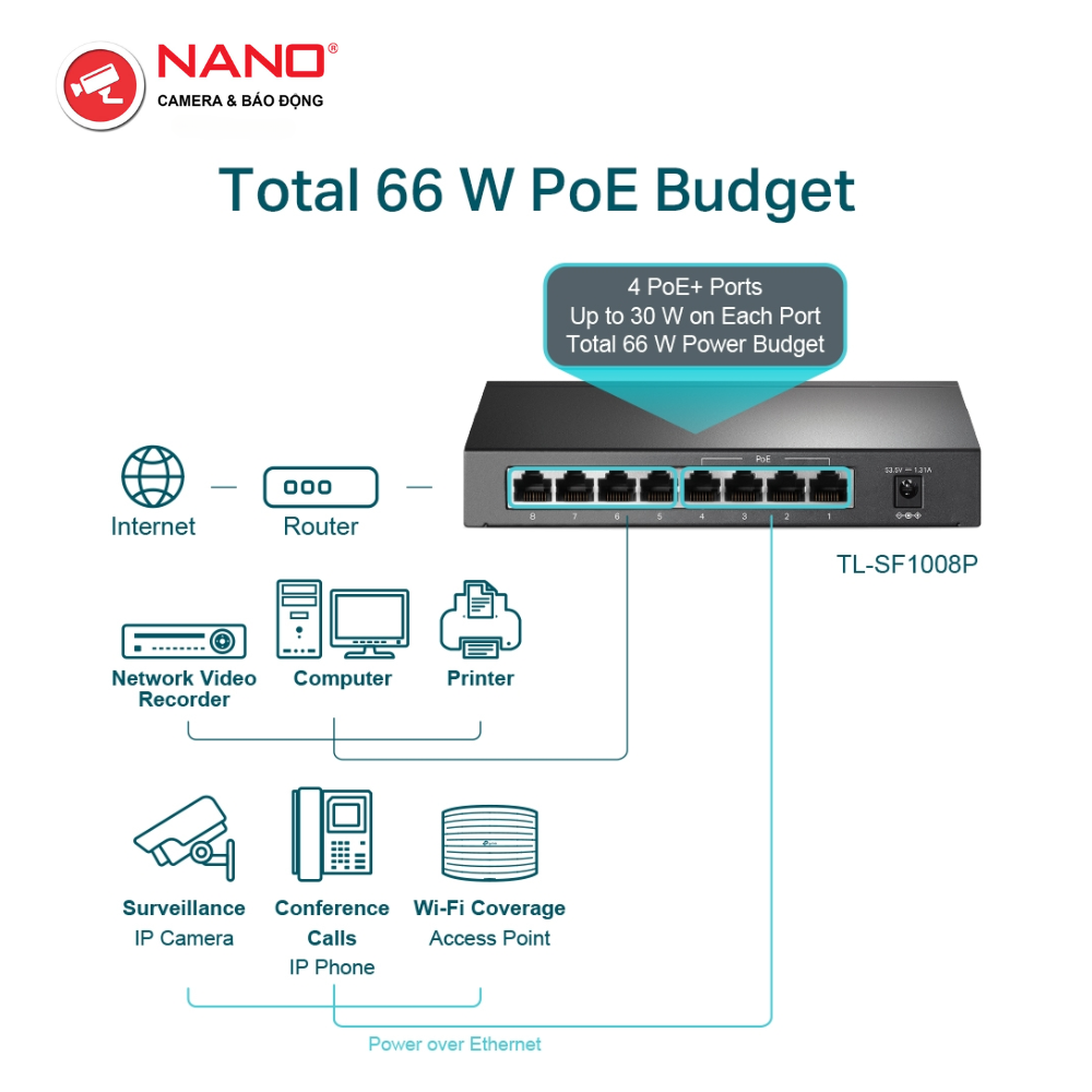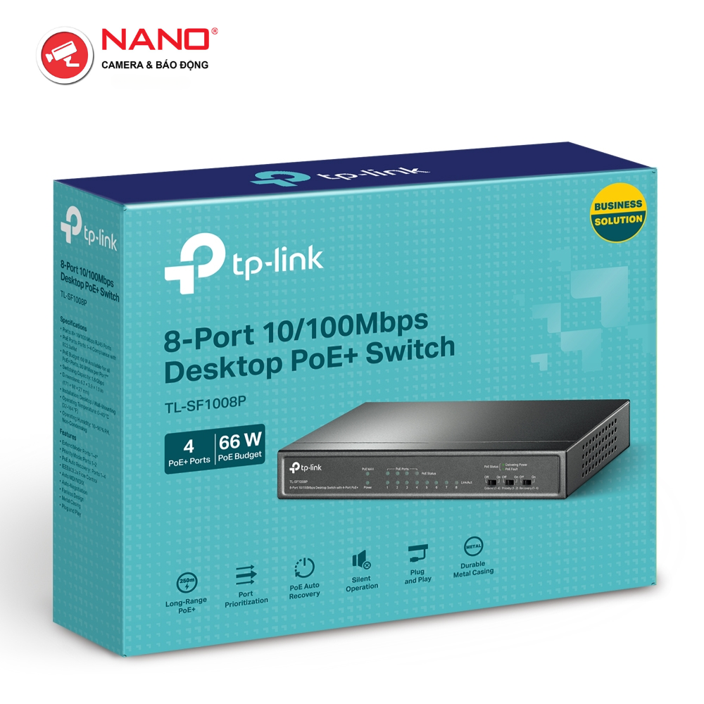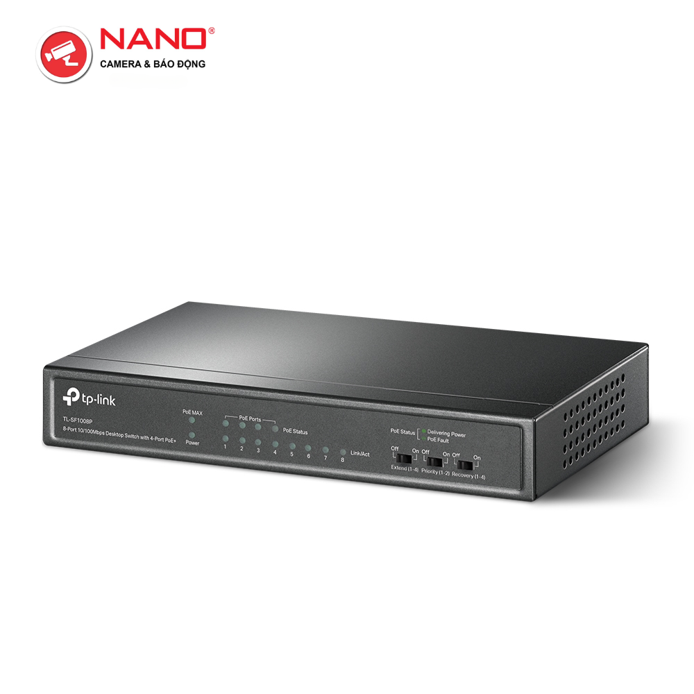 CỔNG: 4x Cổng 10/100 Mbps hỗ trợ PoE+, 4x Cổng 10/100 Mbps không hỗ trợ PoE