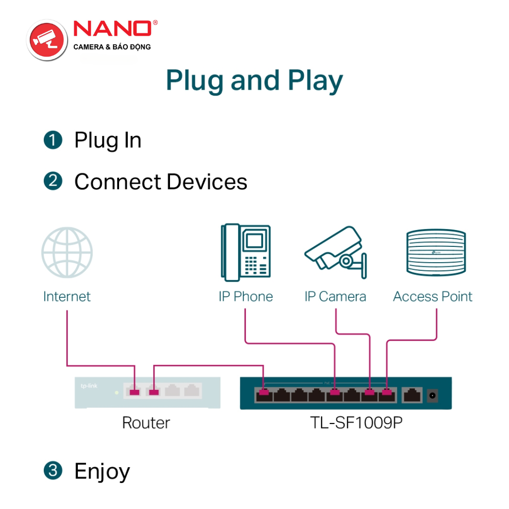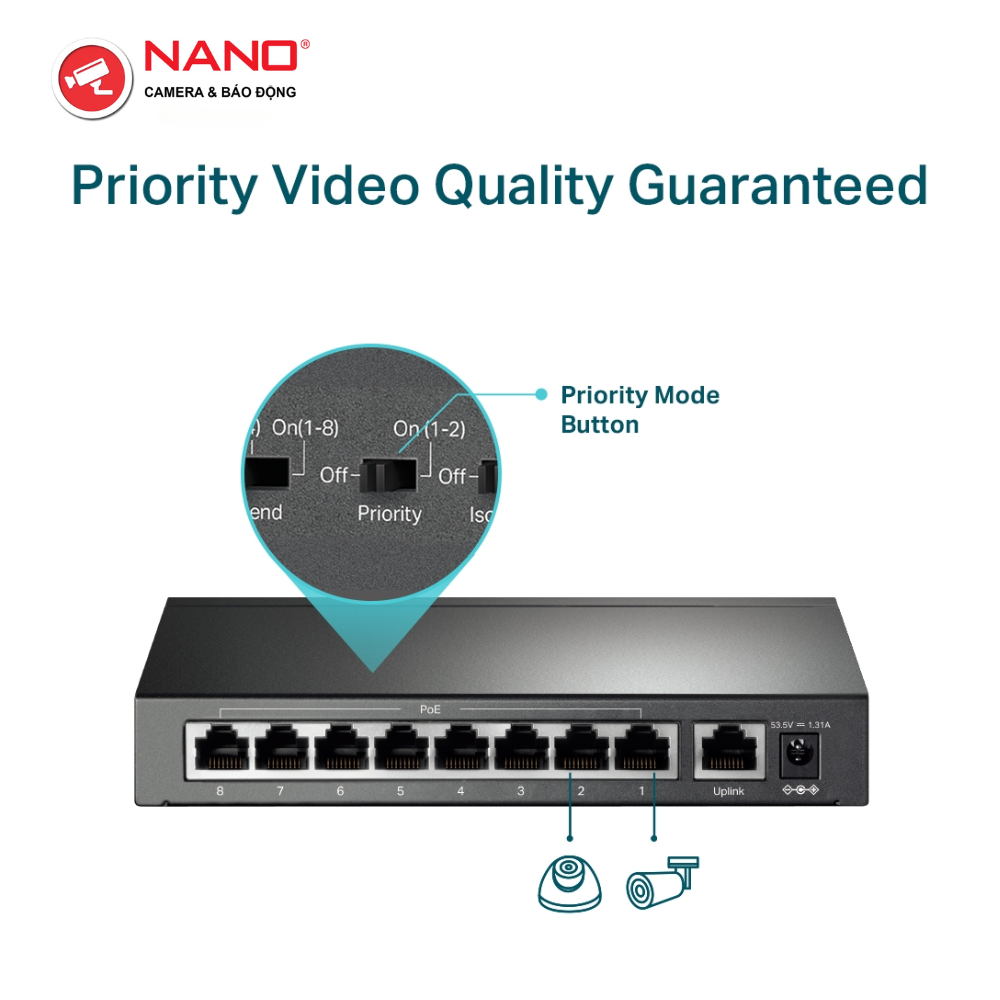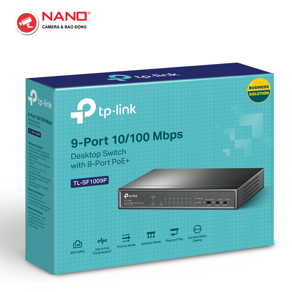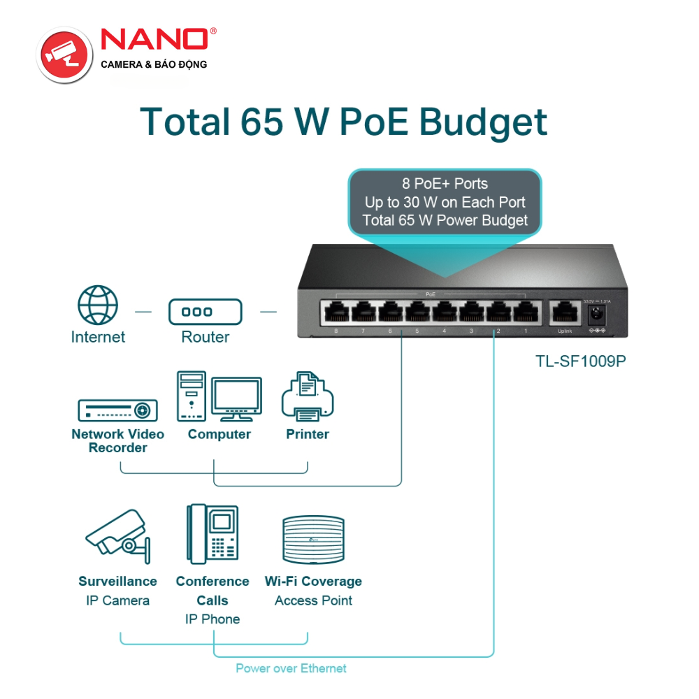 CỔNG: 8x Cổng 10/100 Mbps hỗ trợ PoE+, 1x Cổng 10/100 Mbps không hỗ trợ PoE