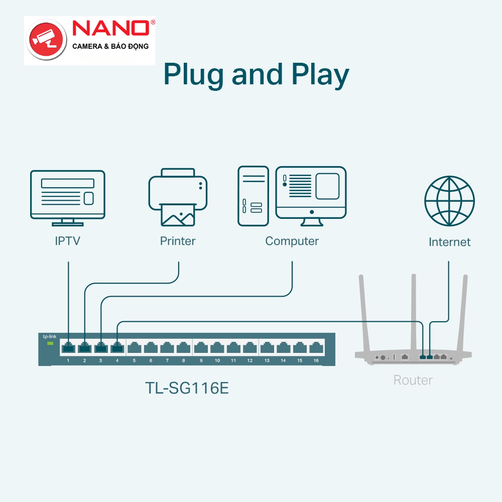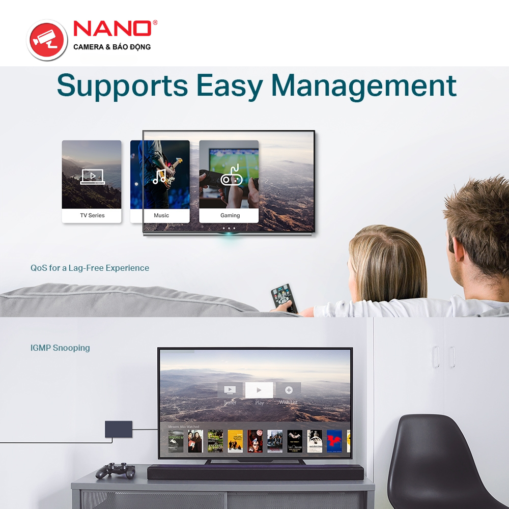 TÍNH NĂNG: VLAN dựa trên MTU/Cổng/Tag, QoS, IGMP Snooping, Quản lý Web/Tiện ích, Cắm và Chạy